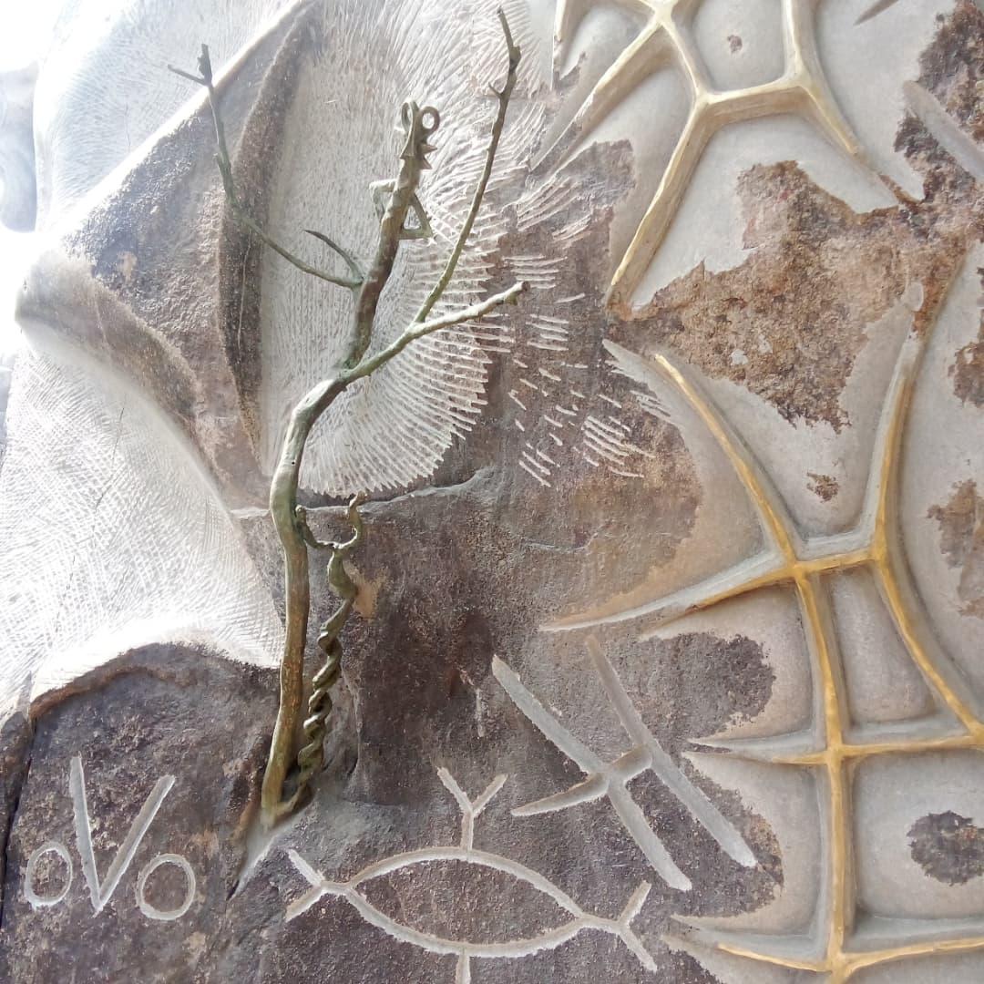« Retour en Afrique » ( 190h-180cm de large) 2018, réalisation à Laongo, au Burkina Faso, sur du granit. Évocation d’un portrait fragmentaire mi-masque mi-femme, composé d’incrustation de bronze dans les yeux. Pour traduire le lien profond au continent, mais aussi la question des racines, pour des personnes issues de l’exode, de la traite négrière à travers les Caraïbes ou les Amériques.