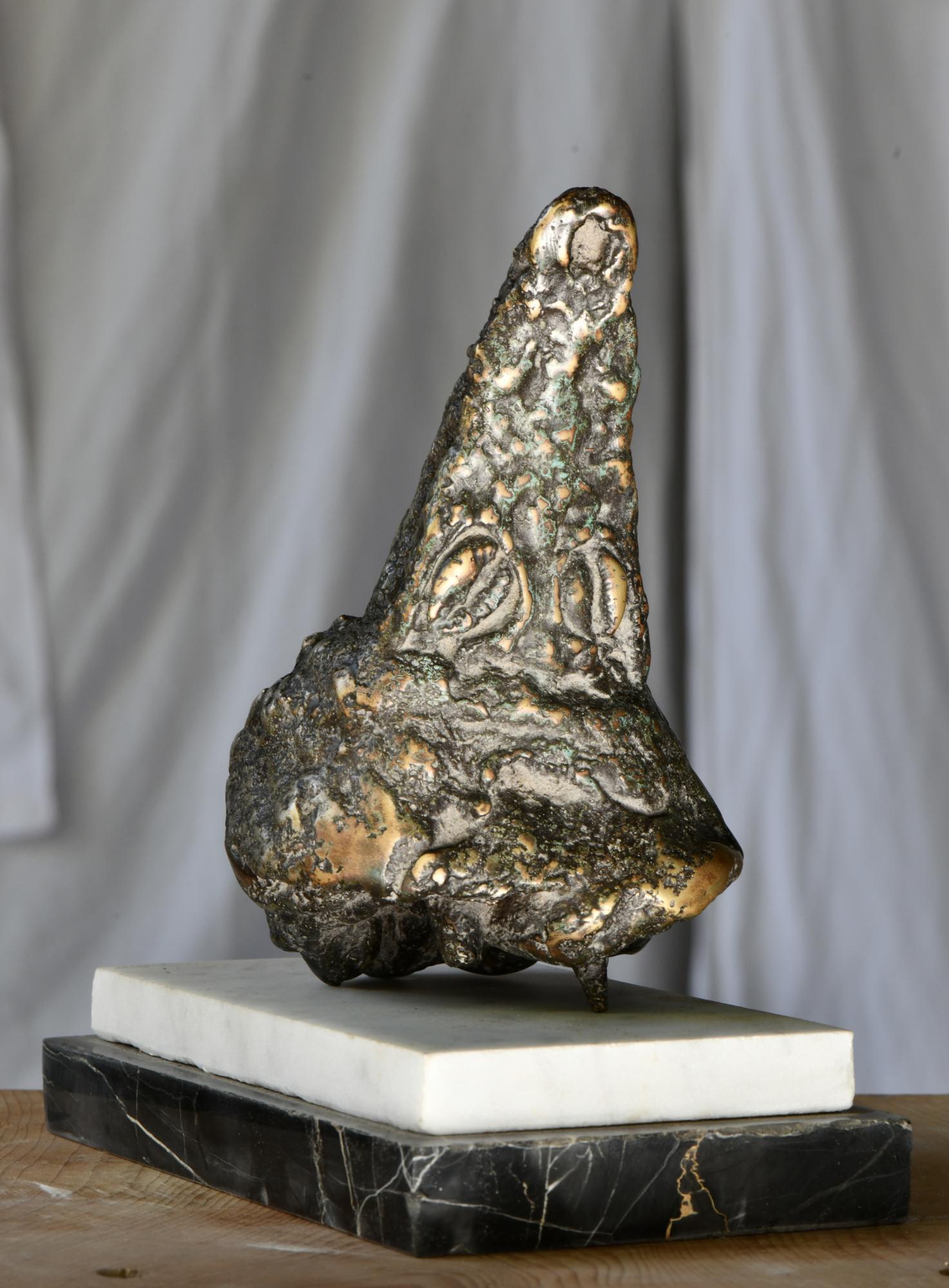 ''Tête Caïman '', bronze organique et socle en marbre, fondu à mon atelier au Jésuites à Angoulême avec Abdoulaye Kabore. Pièce unique réalisé avec l'assemblage de matériaux collectés durant plusieurs moments et localité différentes